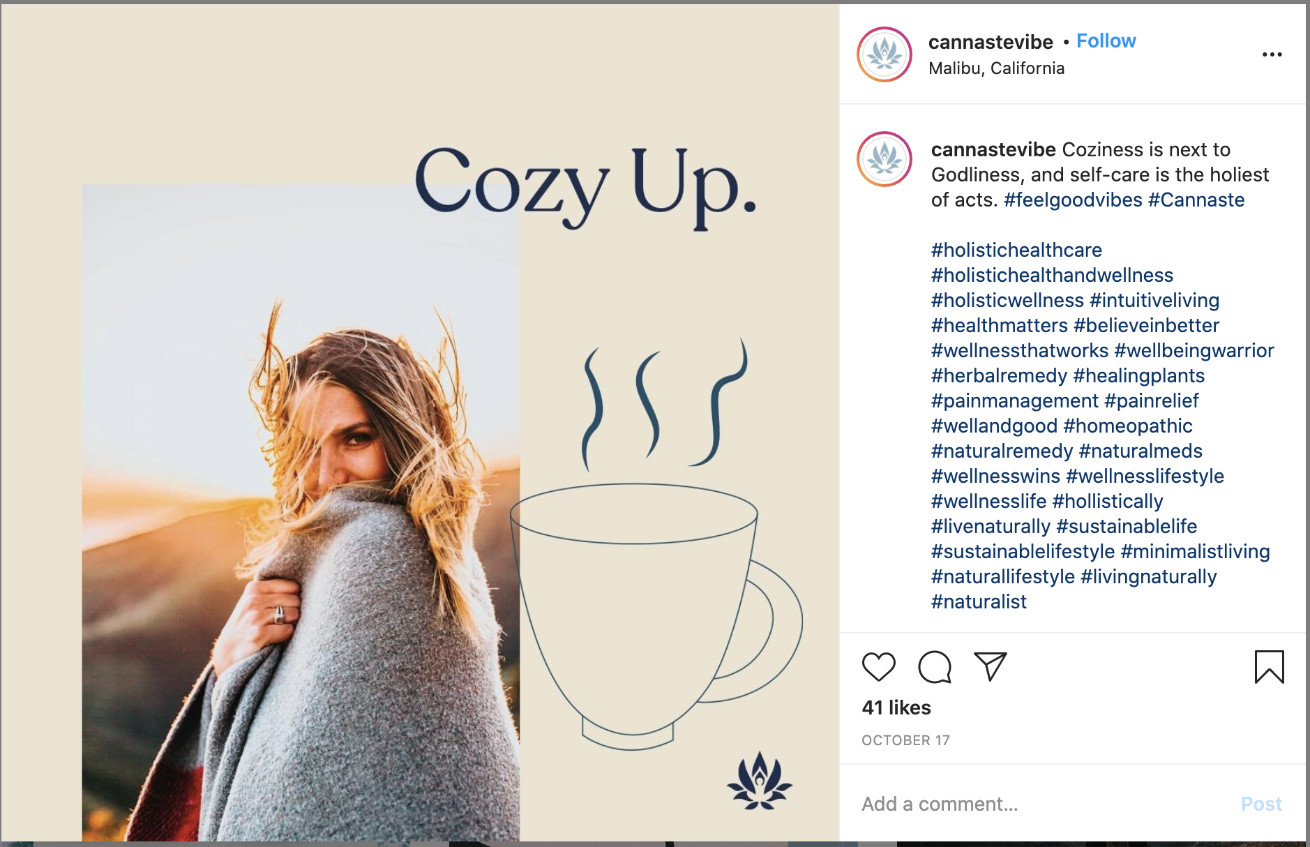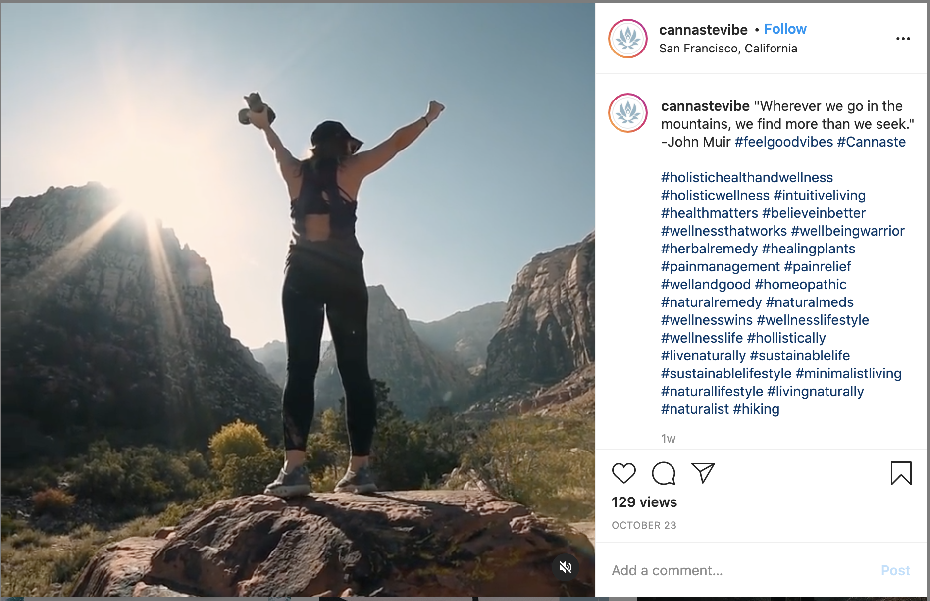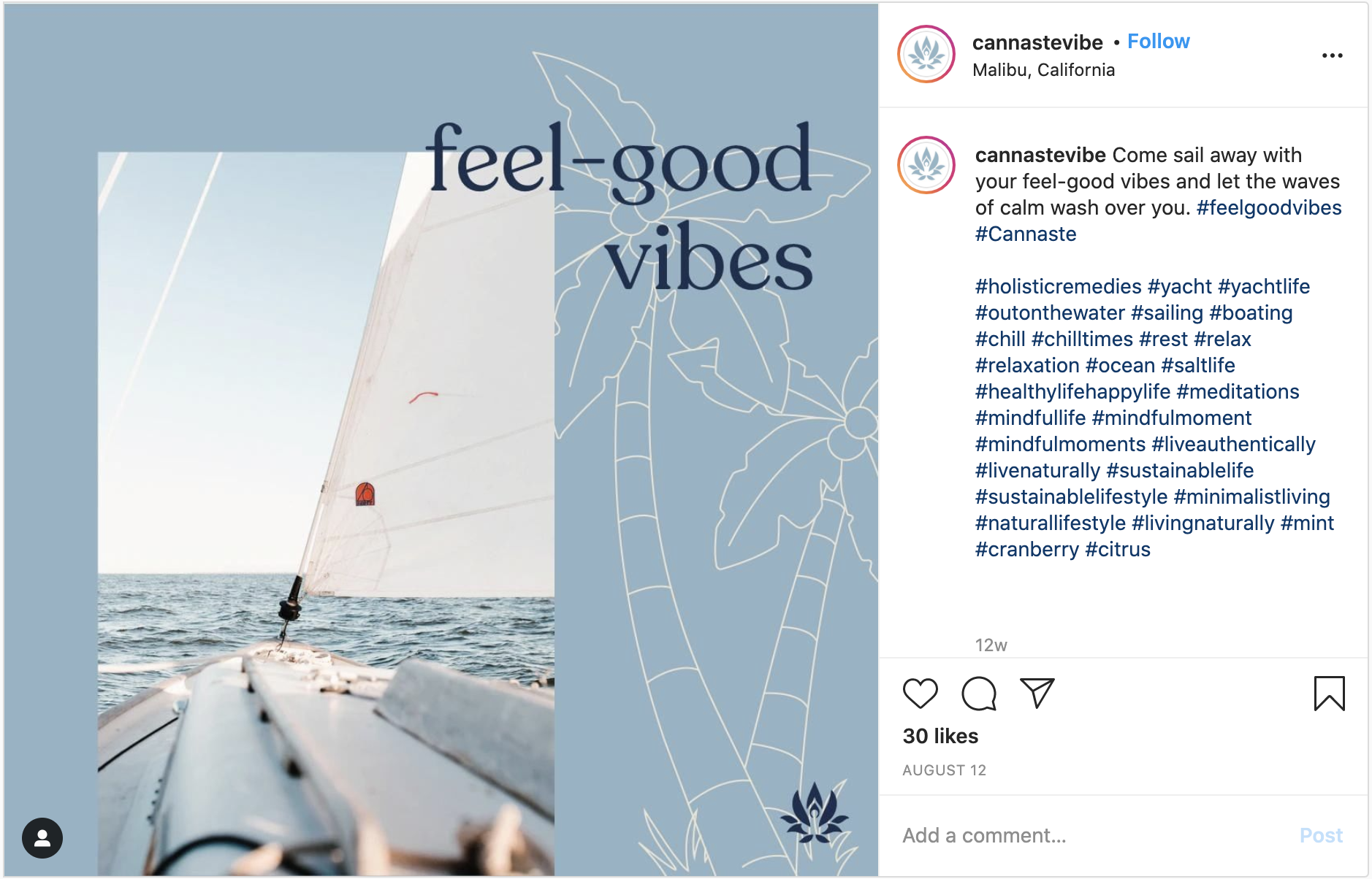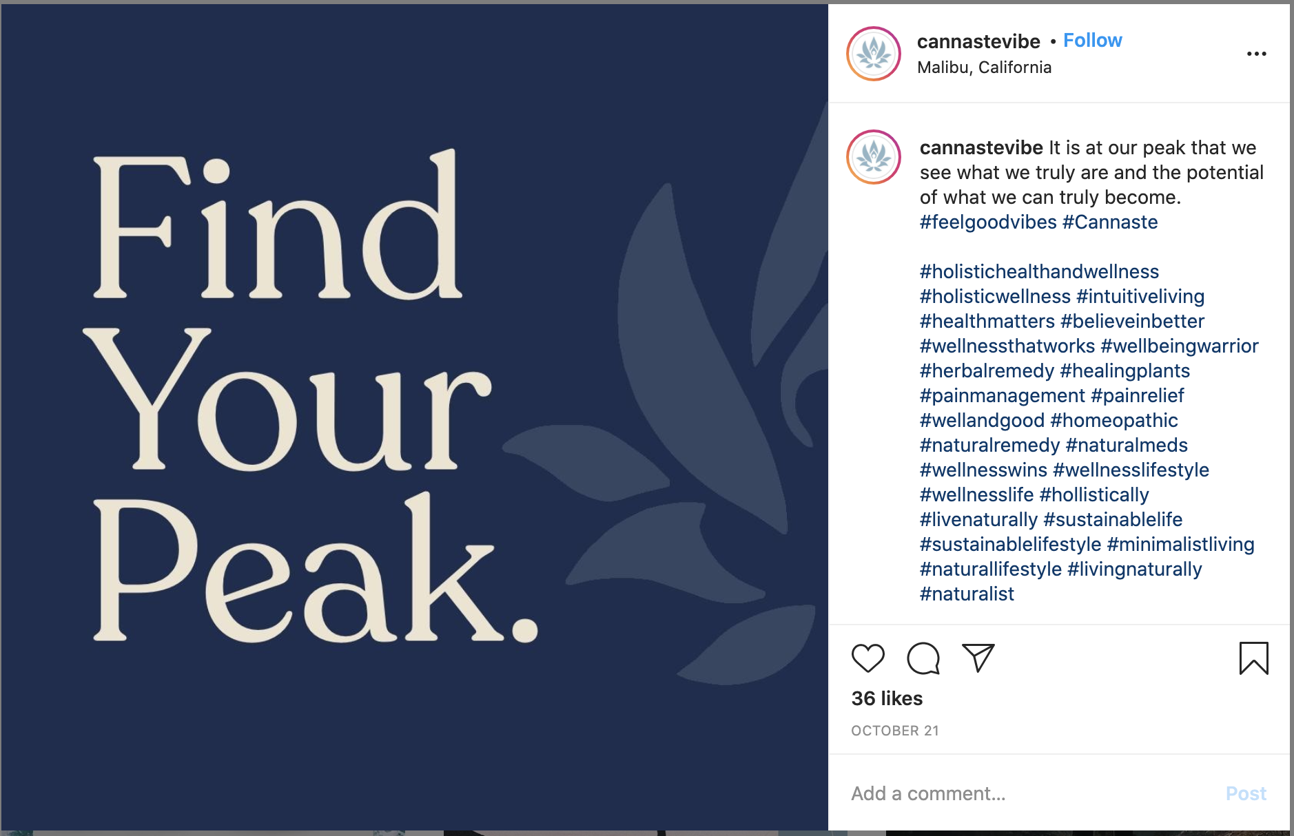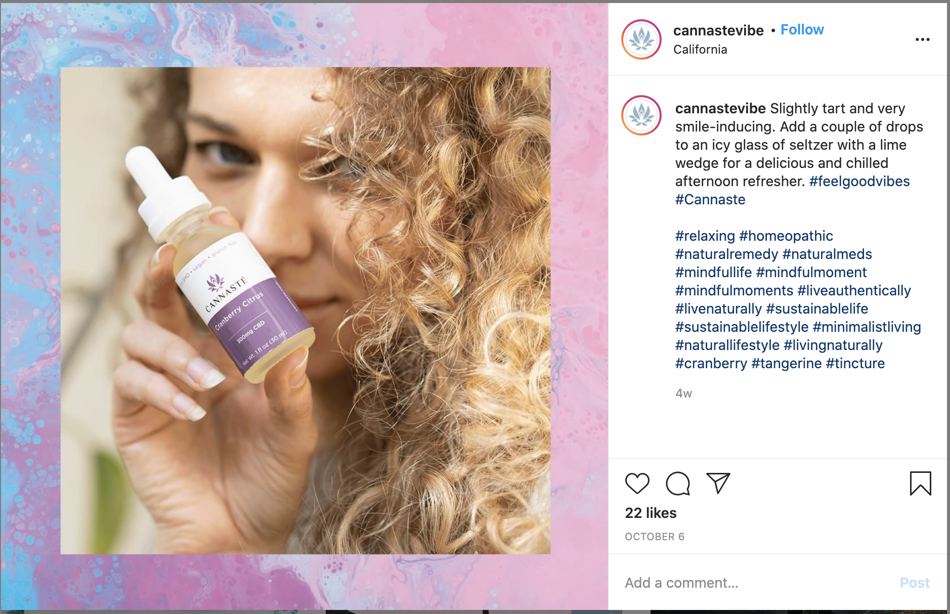 For Cannaste CDB, I was tasked with creating the copy for an instagram posting calendar. Taking on the laid back, California centered vibes, my posts were all about promoting the CBD tinctures that Cannaste specializes in creating.