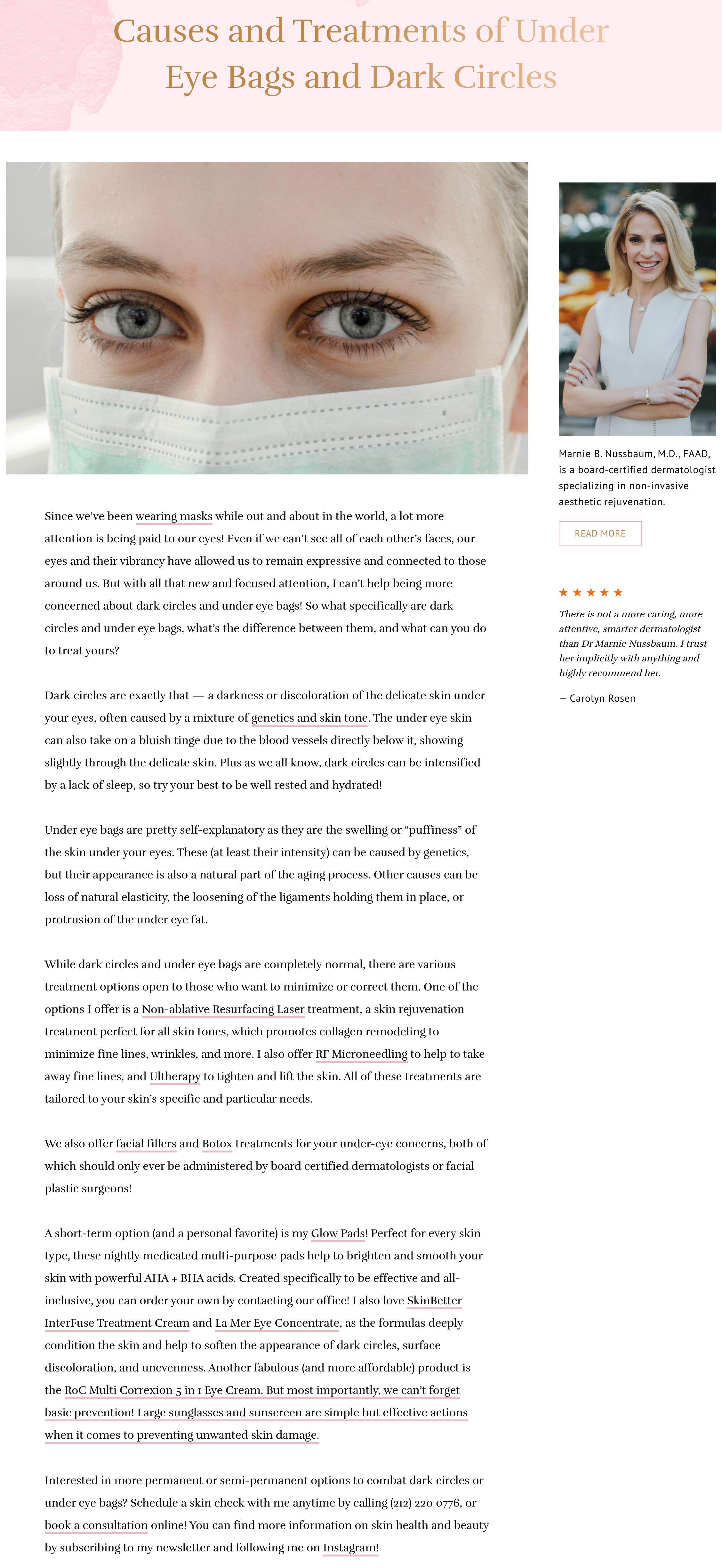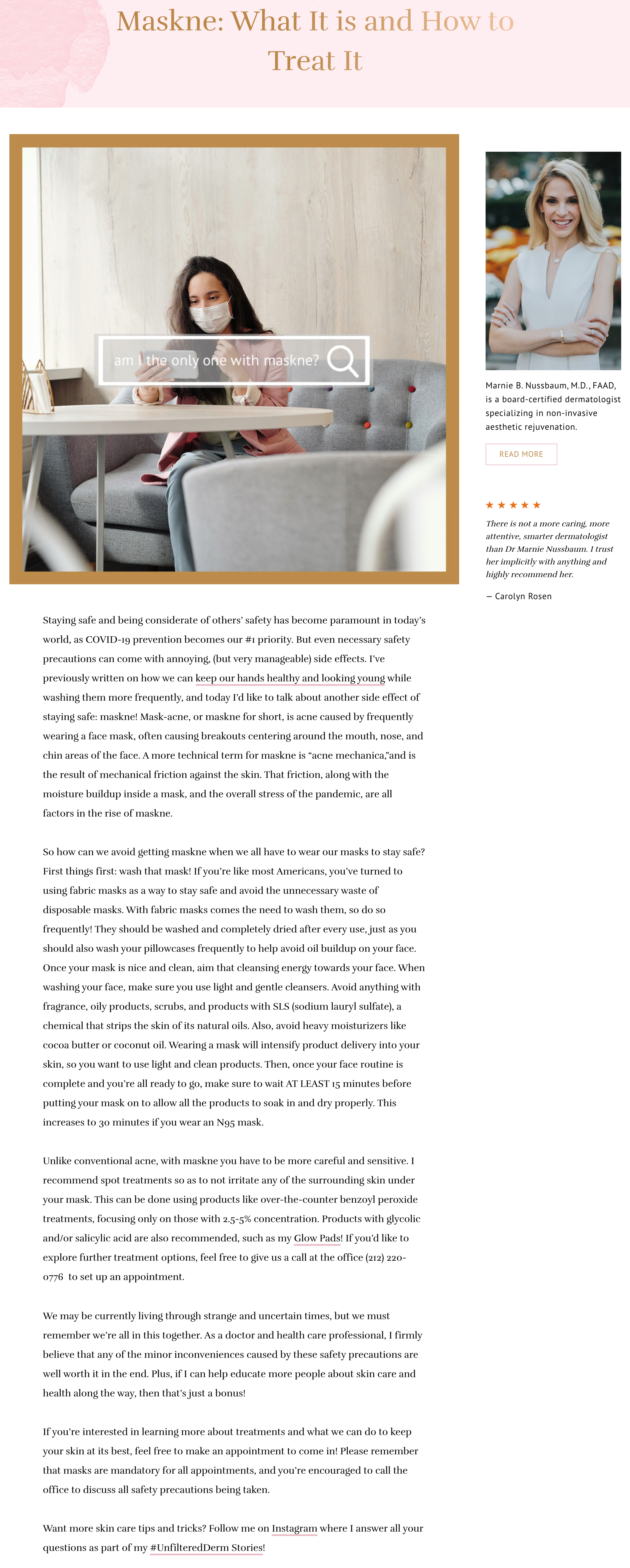 For Dr. Nussbaum, a Cosmetic and Medical Dermatologist, I was tasked with writing various blog posts in the doctor’s informative, friendly voice. Writing these posts involved researching the answers to such prompts as, “The Most Important Skincare Steps at Every Stage of Life” and “How often should I exfoliate?”