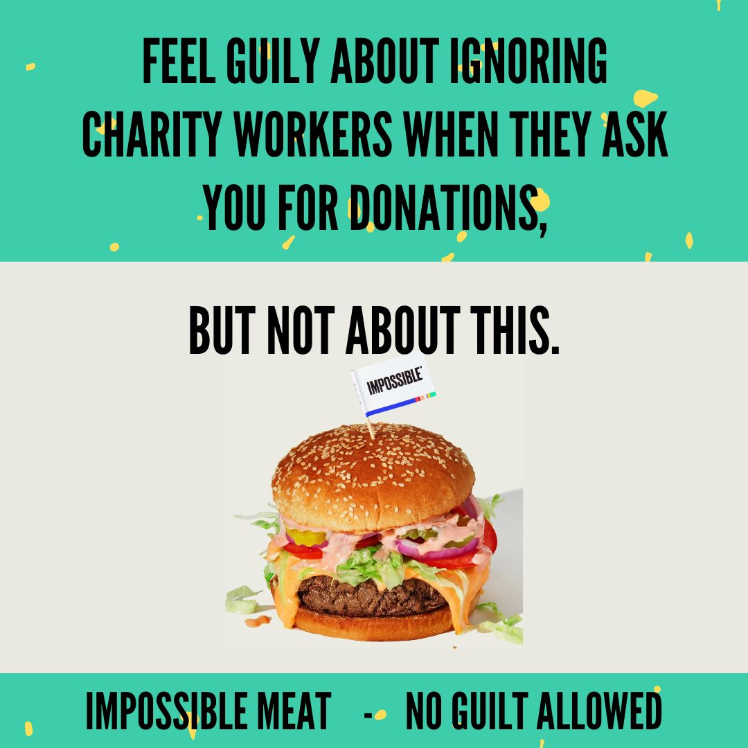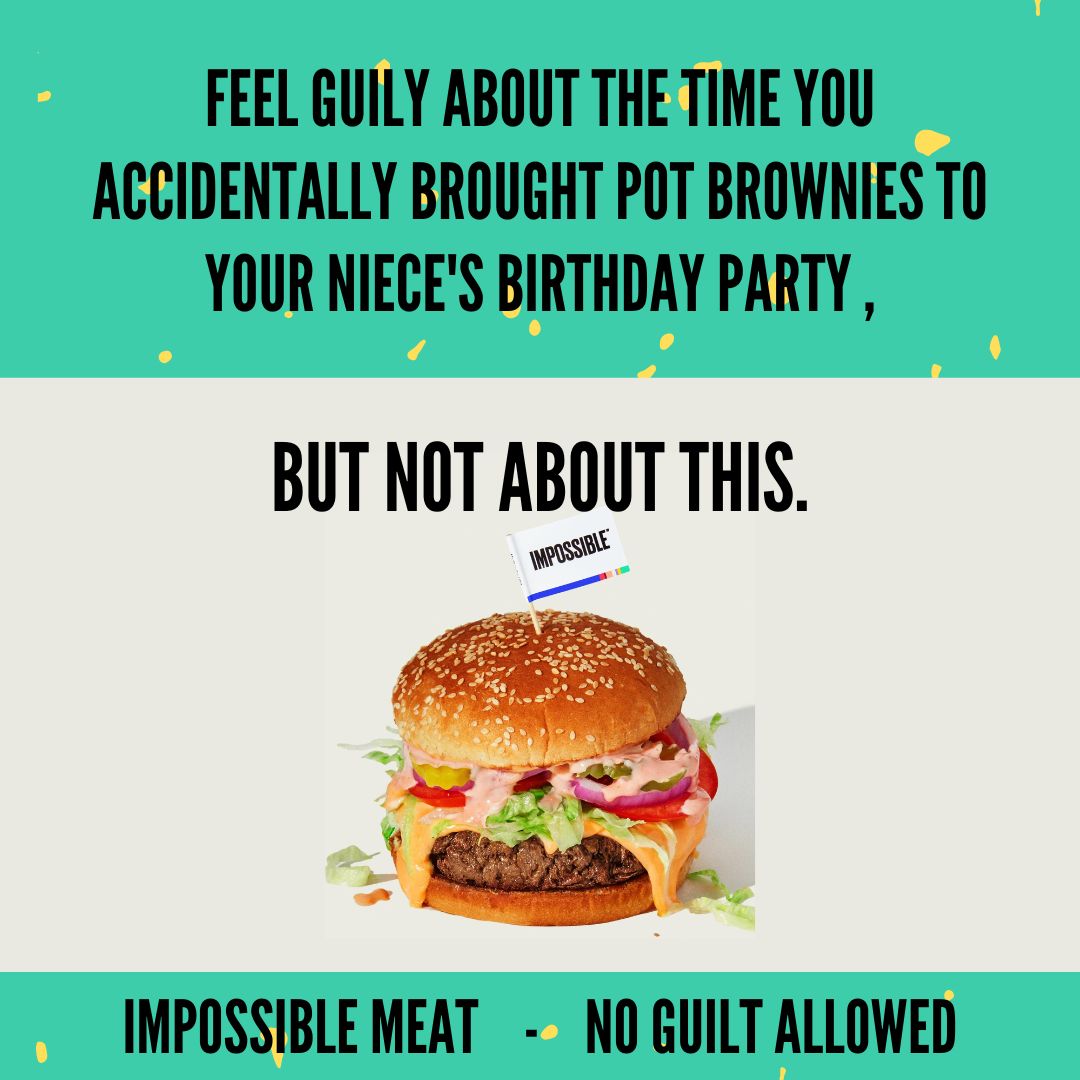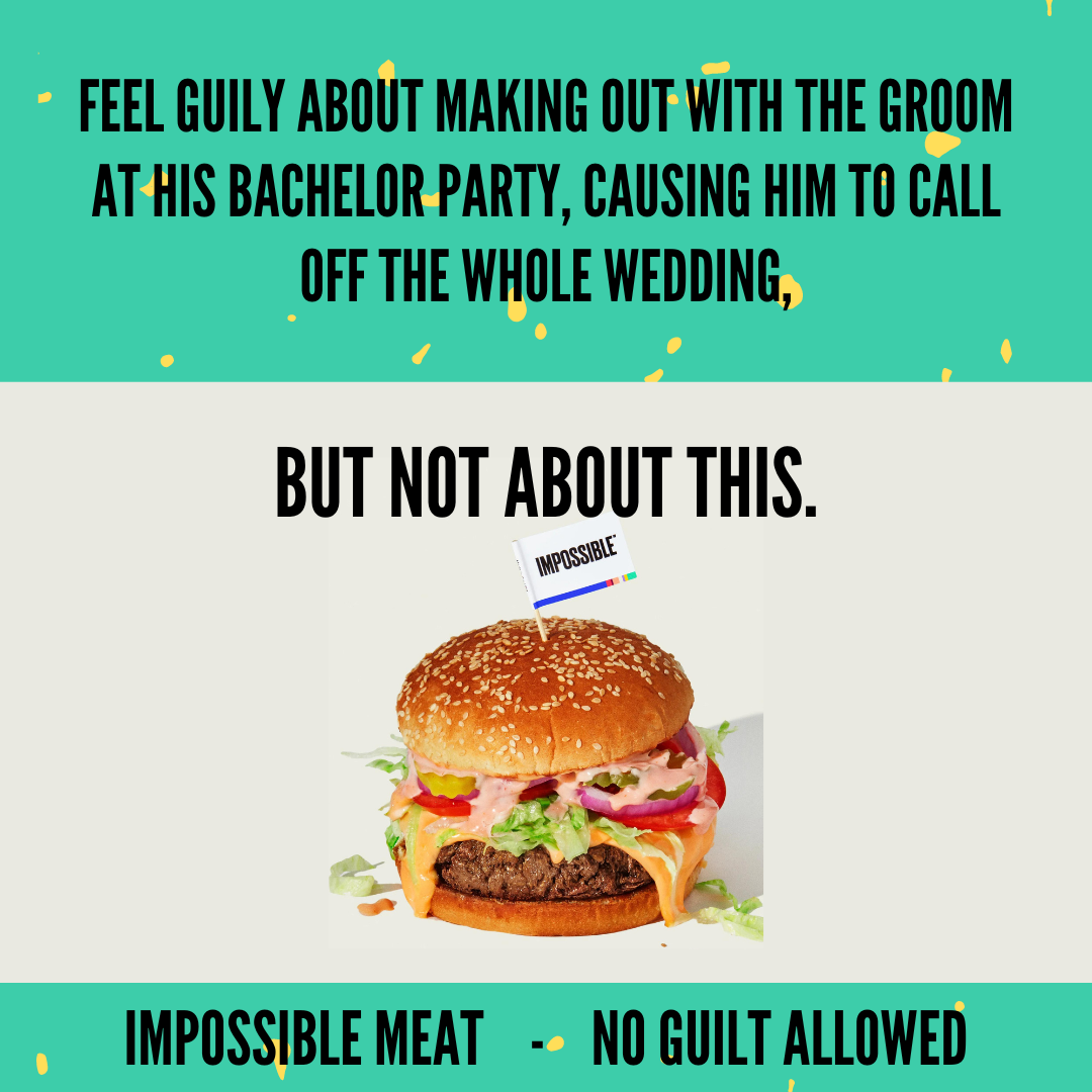 Now, what can Impossible Meat provide? A guilt free meat-eating experience. So feel guilty about all the OTHER bad things you do, but not this. There's no guilt allowed where Impossible Meat is concerned.