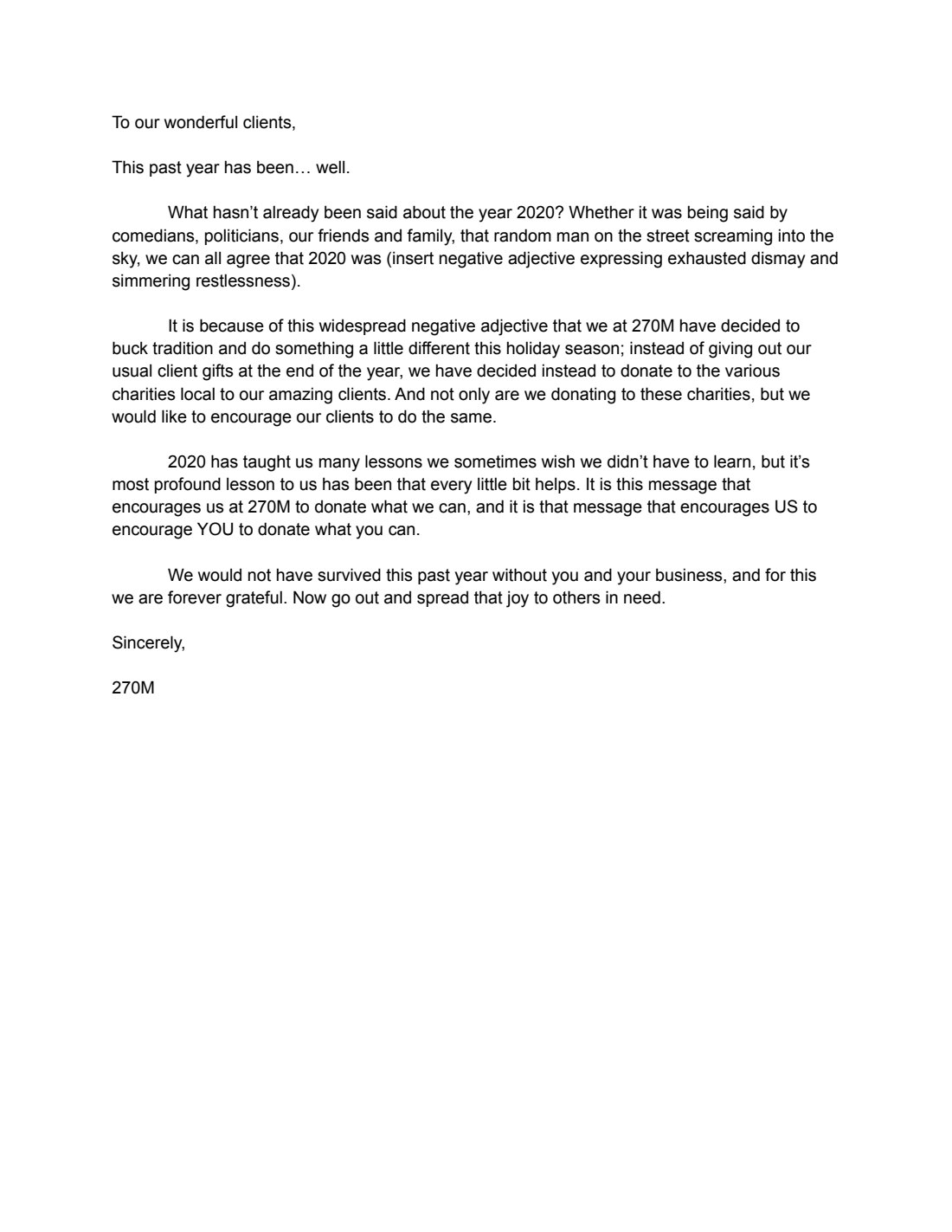 270M was an agency I was working with on a freelance basis. They asked me to write their 2020 End of Year client email. Thankfully, they were kind enough to let me be bitter and sardonic.